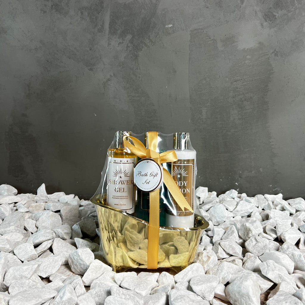 6 stuks badset (shower gel, bubble bath & body lotion) in gouden badkuip: Lily & honeysuckle blooming magnolia