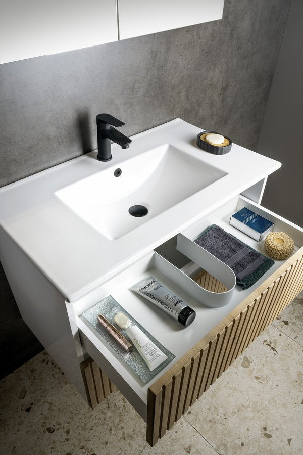 De Aqualine Paneda 80 cm in glans wit met geribbeld Emperio eiken front geeft uw badkamer een luxe uitstraling. Het meubel van gelamineerd MDF beschikt over twee softclose laden zonder grepen, waardoor design en comfort samenkomen. De twee ruime softclose laden sluiten geruisloos en zijn ideaal voor het opbergen van handdoeken, verzorgingsproducten en andere badkamerbenodigdheden..
