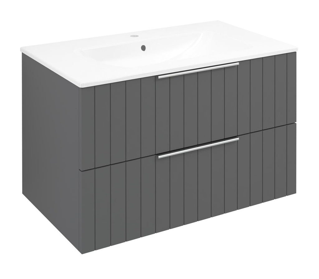 Maak je badkamer compleet met deze Cirasa wastafel onderkast van 80 cm in Carina kleur met geribbeld front. De twee softclose laden houden al je dagelijkse spullen netjes uit het zicht. De doorlopende strip-grepen over de volledige breedte van de laden geven het meubel een moderne, minimalistische uitstraling.