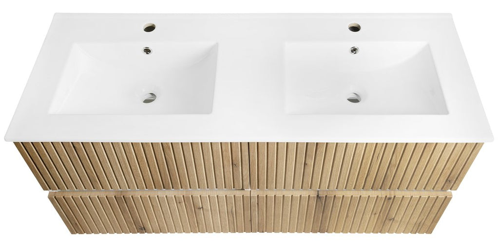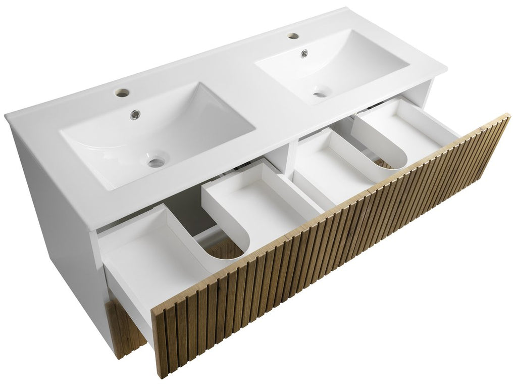 Voor wie nét wat meer warmte en luxe wil toevoegen, is er het Aqualine Paneda badmeubel in glans wit met Emporio eiken geribbeld front. Dit meubel combineert het frisse karakter van glans wit met de natuurlijke uitstraling van hout, afgewerkt in een subtiel geribbeld design.