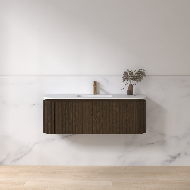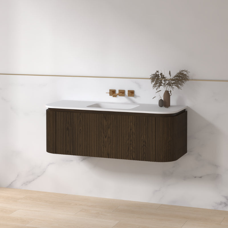 120 cm uitvoering: Dark Walnut, met kraangat. Ribbelfront Eleganza met royale opbergruimte en tijdloze afwerking.