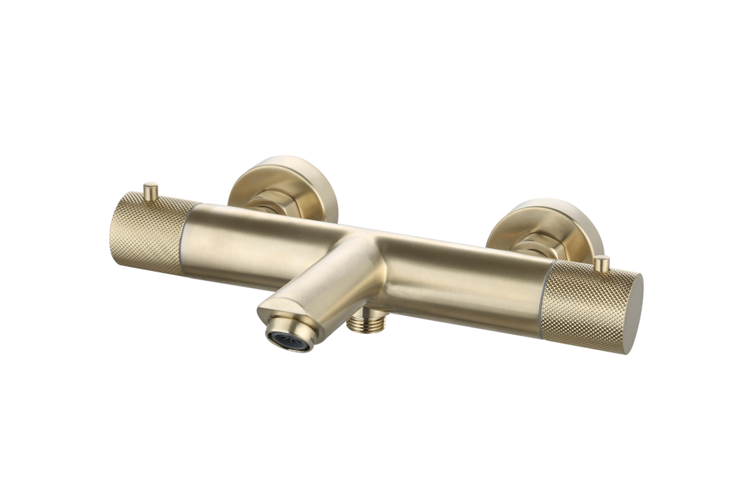 Luzi Badmengkraan thermostatisch rond Goud Geborsteld met geribbeld knop geeft je badkamer direct een luxe hotelsfeer. De badmengkraan in goud geborsteld combineert een strak, rond design met comfortabele bediening. De kraan vult je bad snel en comfortabel en is een echte blikvanger aan de muur. De subtiele geribbelde bediening geeft extra grip en een luxe, speels detail.