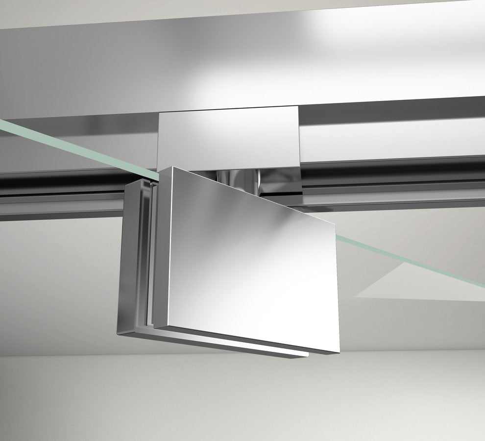 Stabiele draaideur in frame met gepolijste chroomprofielen. Het 6 mm heldere veiligheidsglas is voorzien van een antikalk-coating en de deur is links of rechts te plaatsen.
