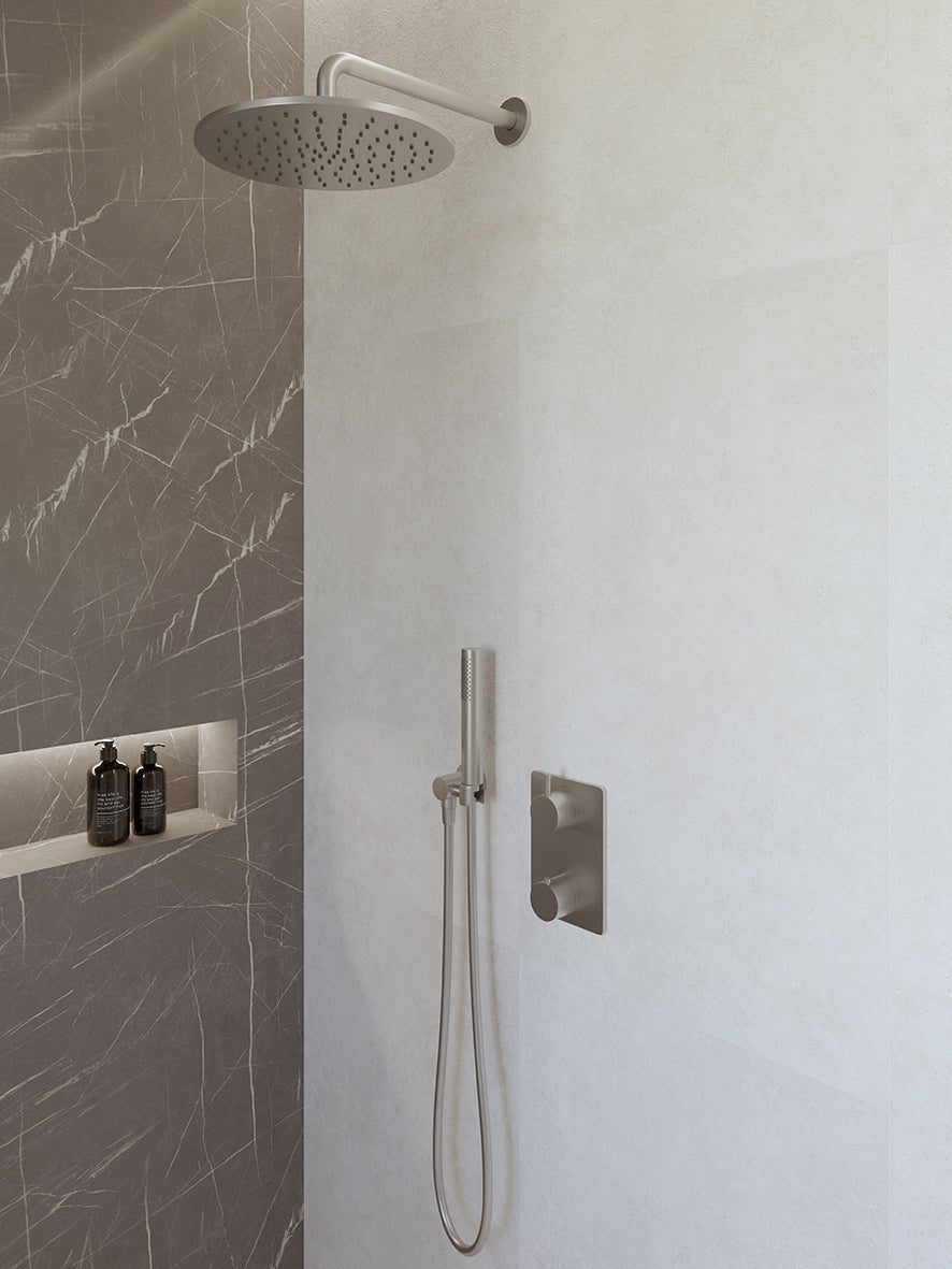 Caral inbouwthermostaat compleet met hoofddouche 30 cm, staafhanddouche, doucheslang en -arm geborsteld staal