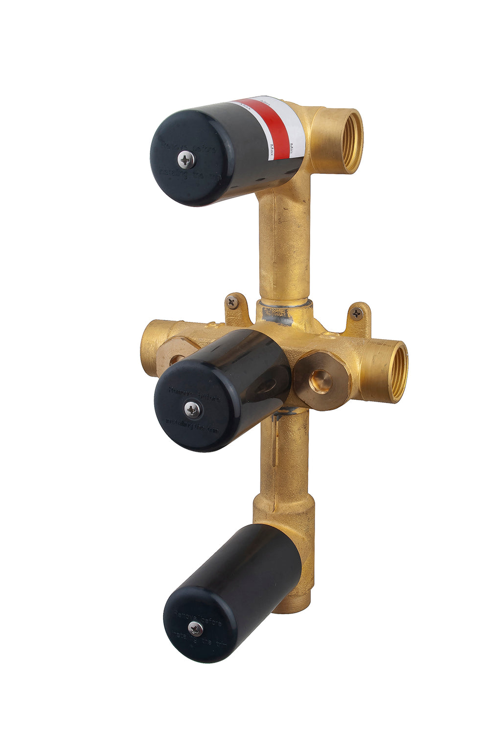 Inbouwkraan thermostatisch zonder afbouwset. 3/4" binnendraad aansluitingen, keramische omstelknop(pen), Easy-Clean filters- en terugslagkleppen. Deze zijn eenvoudig te verwijderen en terug te plaatsen wanneer de kraan in de muur zit. Blokkering op 38 graden. Geschikt voor de Caral, Rombo of Cross afbouwset...(apart te bestellen)
