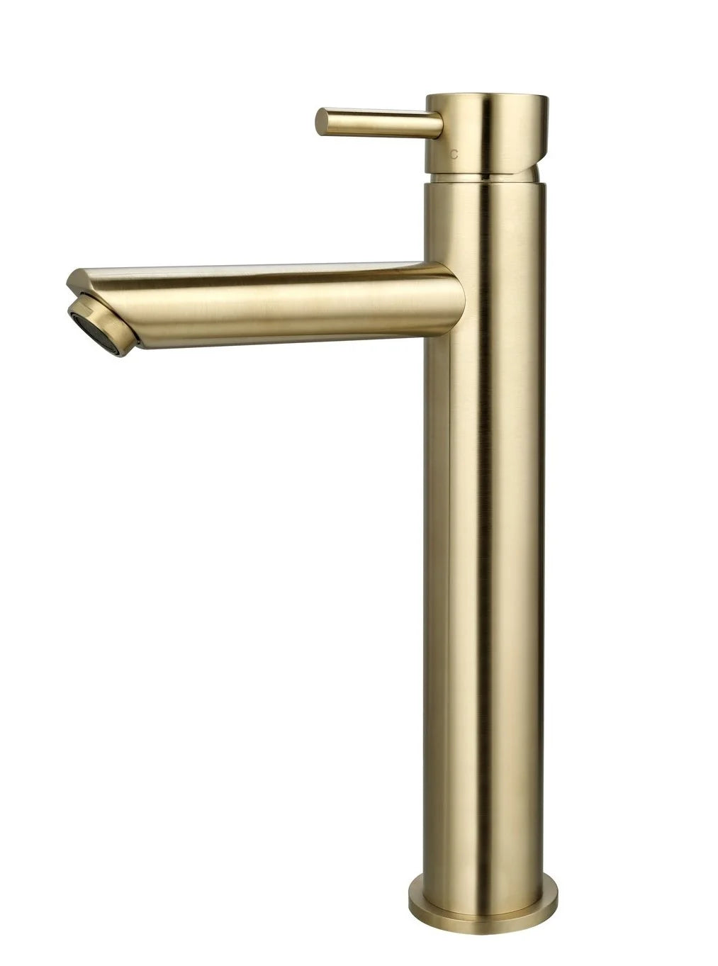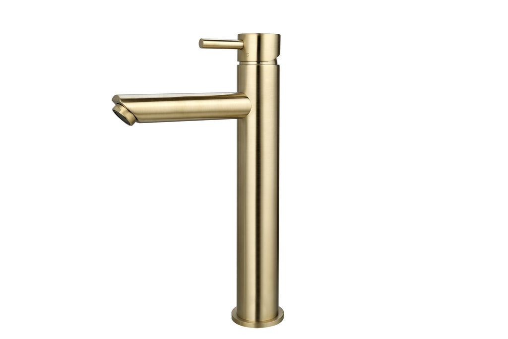 Luzi Wastafelmengkraan hoog rond Goud Geborsteld geeft je badkamer direct een luxe hotelsfeer. De wastafelmengkraan hoog in goud geborsteld combineert een strak, rond design met comfortabele bediening. De hoge uitloop is ideaal in combinatie met een waskom op het blad.