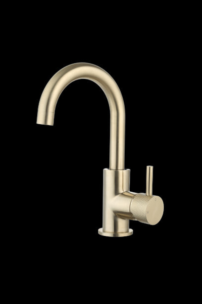 Luzi Wastafelmengkraan Largo met draaibare uitloop Goud Geborsteld met geribbeld knop geeft je badkamer direct een luxe hotelsfeer. De wastafelmengkraan in goud geborsteld combineert een strak, rond design met comfortabele bediening. De subtiele geribbelde bediening geeft extra grip en een luxe, speels detail.