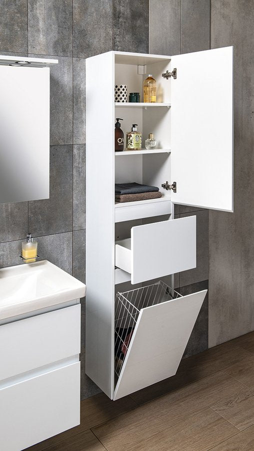 Hoge badkamer kolomkast Altair in wit met greeploos design en Hettich soft-close. Dankzij meerdere schappen en een lade berg je handdoeken en toiletartikelen overzichtelijk op. Afmetingen: 40×31×184 cm (b×d×h). Materiaal: MDF gelamineerd. Verzending: gratis. Garantie: 2 jaar.