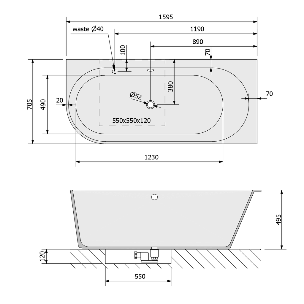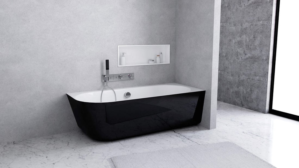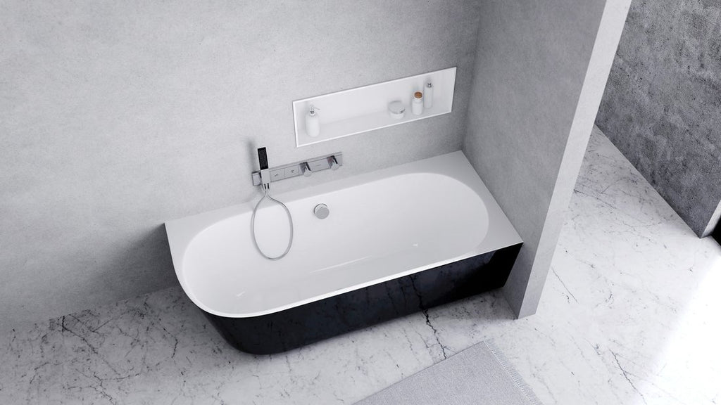 De Sussi is een vrijstaand hoekbad in Cast Marble, 160x70x49,5cm, rechts uitvoering in Zwart/Wit. Het bootst de luxe marmerlook na, voelt warm aan en blijft dankzij de massieve opbouw jarenlang mooi. Let op: bij montage dient de sifon in de vloer verzonken te worden.