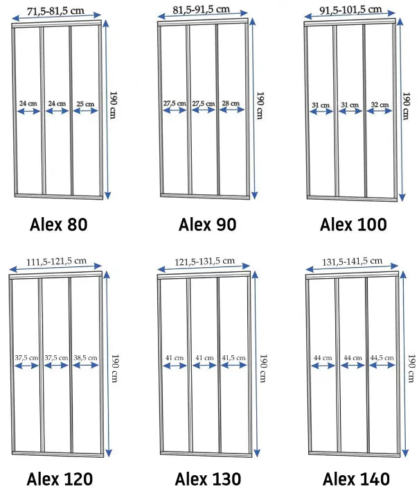 De Alex douchedeur is in verschillende breedte verkrijgbaar van 80 to 130cm waardoor een verstelling mogelijk is tussen 71,5 en 131,5cm. U kunt hier dus bijna altijd de juiste breedte voor U bij vinden. De verstelbaarheid krijgt U door de douchedeur uit elkaar te halen en de boven en onder geleiding op de juiste maat in te korten.