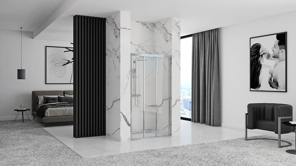 De driedelige douchedeur Rea Alex is een schuifdeur die bestaat uit 3 delen waarvan 1 deel een vaste ruit is en twee delen schuifbaar. Hierdoor heeft U altijd een ruime instap in Uw doucheruimte. De ruiten van de douchedeur zijn makkelijk schoon te houden omdat deze zijn voorzien van antikalk coating.