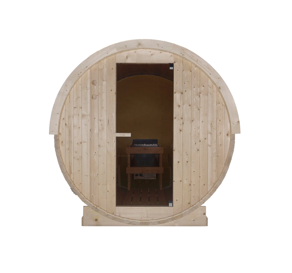De cabine is gemaakt van stevig vurenhout met een wanddikte van 3,8 cm voor goede warmte-isolatie en stabiliteit. Binnenin zorgen twee extra lange zitbanken (ca. 193,5 × 47,8 cm) voor comfortabel zitten met meerdere personen.