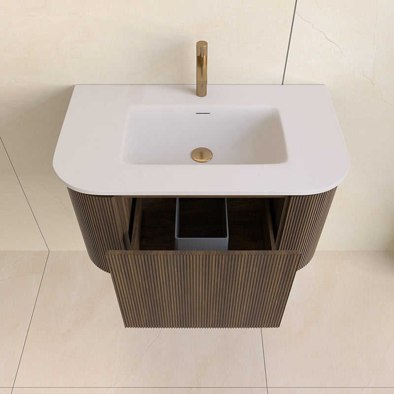 De badmeubelset bestaat uit het meubel en een bijpassende witte wastafel gemaakt van Solid Surface. De wasbak zit in het midden en heeft aan de zijkanten ruimte om badkamer spullen of decoratie neer te zetten.