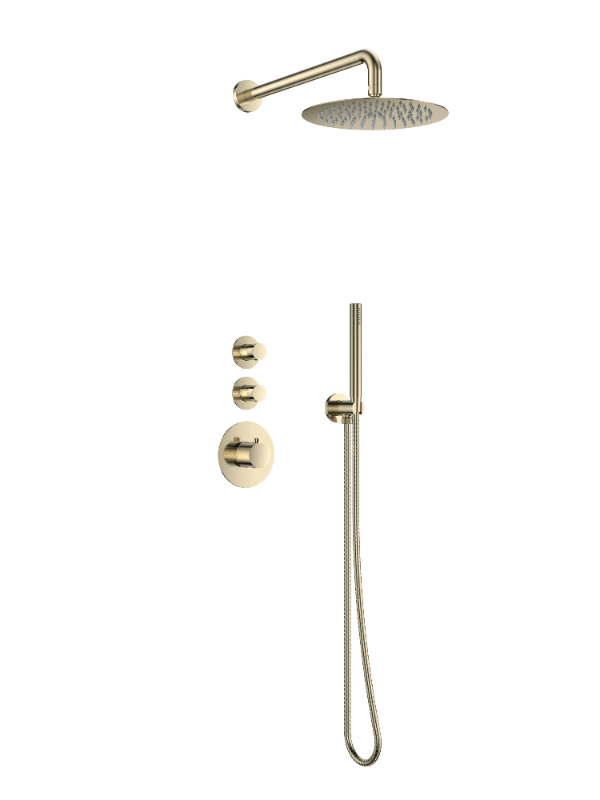 Luzi Doucheset inbouw deluxe met box thermostaat, muurbevestiging / douchekop 25 cm rond Goud Geborsteld geeft je badkamer direct een luxe hotelsfeer. De douchemengkraan in goud geborsteld combineert een strak, rond design met comfortabele bediening. De kraan vormt het hart van je doucheset en zorgt voor een stabiele watertemperatuur.