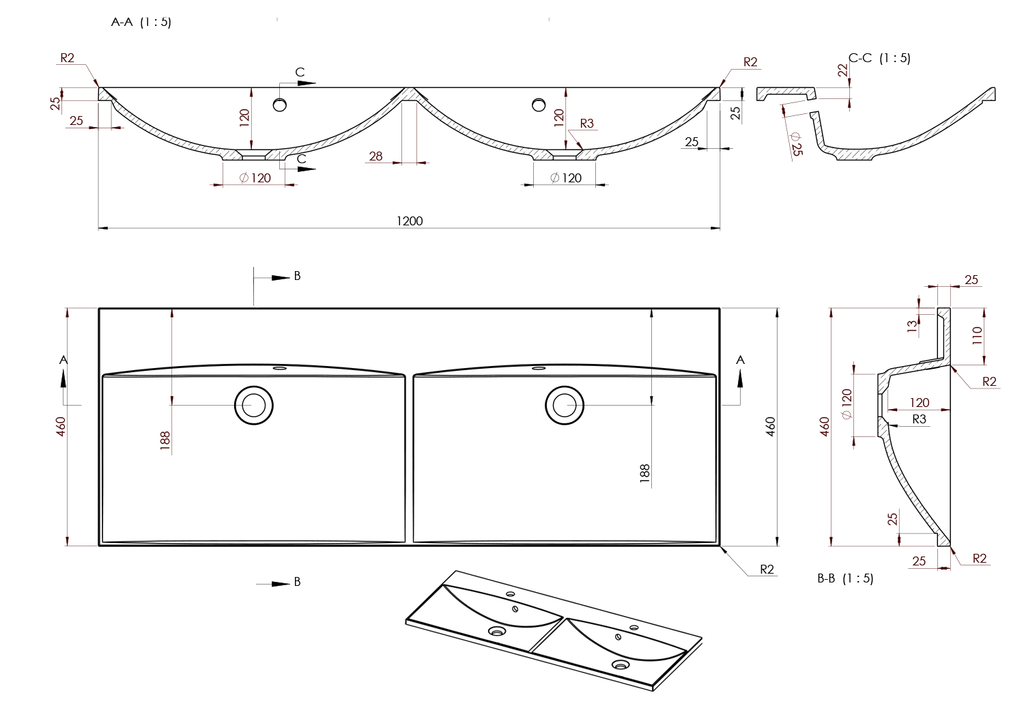 De Maria meubelwastafel van 120 x 46 cm is gemaakt van hoogwaardig gegoten marmer en is bedoeld voor montage op een badkamermeubel. Dankzij de dubbele wasbak en de rustige vormgeving past deze wastafel perfect in een hedendaagse badkamer.
